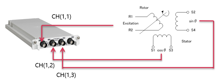 使用MR6000 的波形运算功能。设置励磁信号,cosθ、sinθ信号的波形运算公式后,求得电机的旋转角度。