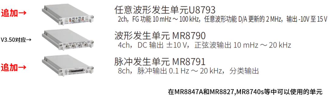 MR6000 V4.01新增了更多可选单元:MR8790(4ch)/MR8791(8ch),从而实现DC/正弦波/脉冲发生。