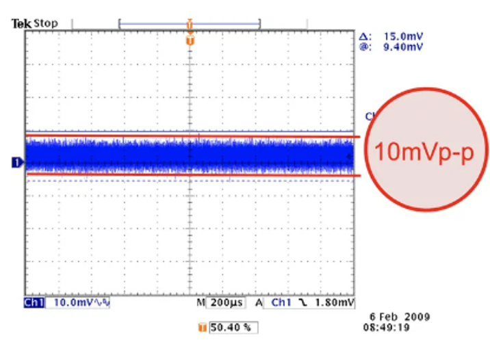 ISO7637-2标准规定,在试验中所使用电源的纹波噪声应为「Vp-p<200mV」。另外,汽车制造商标准也有要求「Vp-p<100mV」的情况。