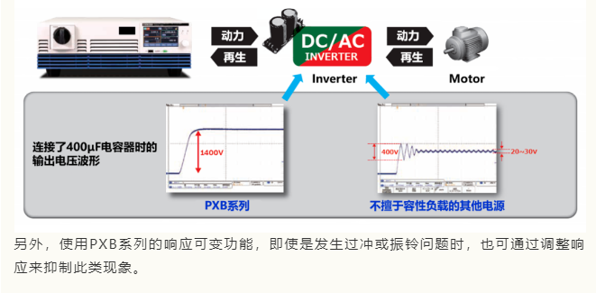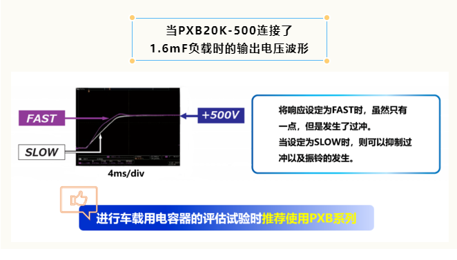 菊水的双方向大功率直流电源PXB系列是事先设想了连接此类容性负载(电容器等)的情况下所开发的产品,所以即使是连接了数百μF的容性负载也可提供稳定的输出波形。通常对于容性负载的输出波形稳定性是不会在彩页或者是说明书上记载的,所以很多用户都会忽视这个功能,但是一旦忽视这个功能,则可能导致提供的功率波形不稳定从而影响试验结果、并且其再现性也会下降。所以对于容性负载来说输出波形的品质可以说是至关重要的。