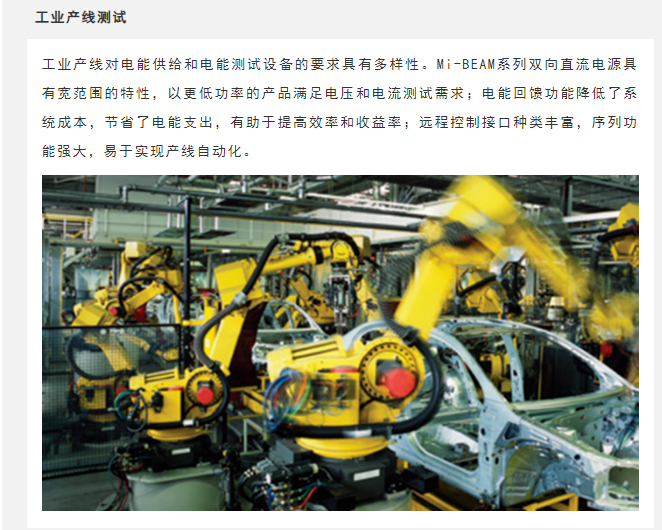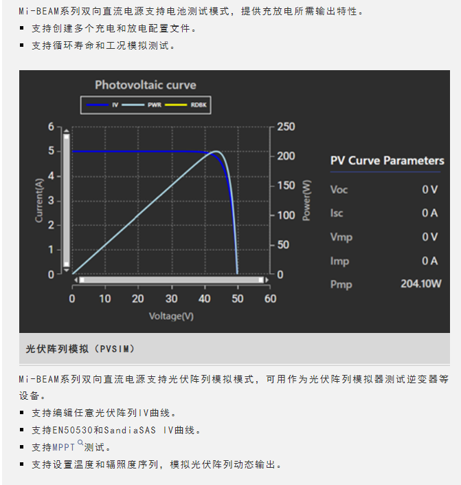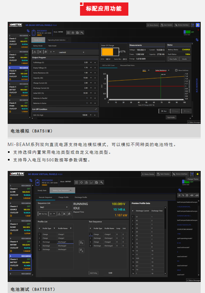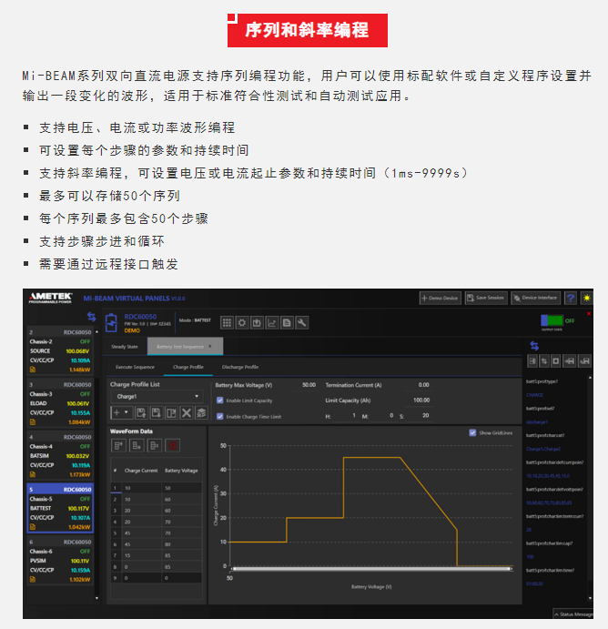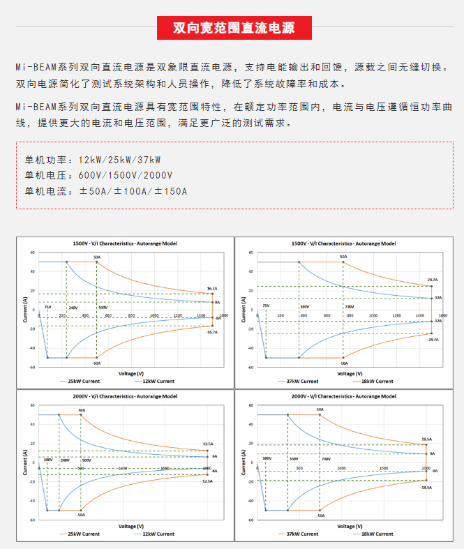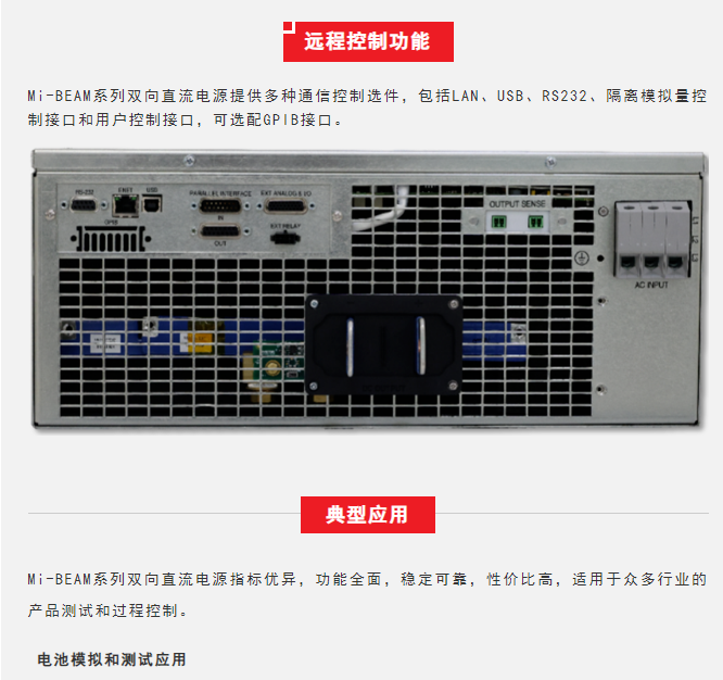 Sorensen™品牌Mi-BEAM系列产品是阿美特克程控电源事业部最新发布的高性能双向直流电源,单机4U高,功率可达37kW,并联功率可达1.2MW,电压范围600V到2000V(80V型号即将发布),单机电流±50A到±150A。其支持双向模式、电源模式和负载模式,标配电池模拟、电池(充放电)测试和光伏阵列模拟功能,支持序列编程和斜率编程,提供多种控制接口,广泛适用于多种行业的过程控制和测试应用。