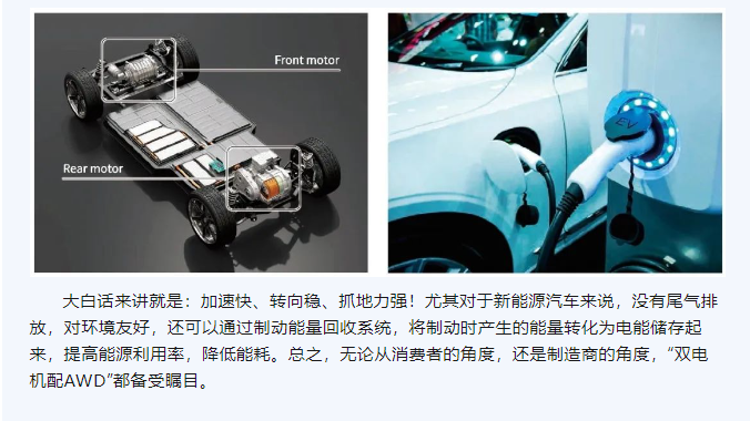 我们在购车时,经常会看到这样的广告“双电机配AWD!” “破百xx 秒!” “续航超xx 公里!” 这里的“双电机配AWD” ,其实是一种使用两个电动机分别驱动前后轮的汽车驱动方式,可以实现更加灵活的扭矩分配,从而提升车辆的操控性和安全性。