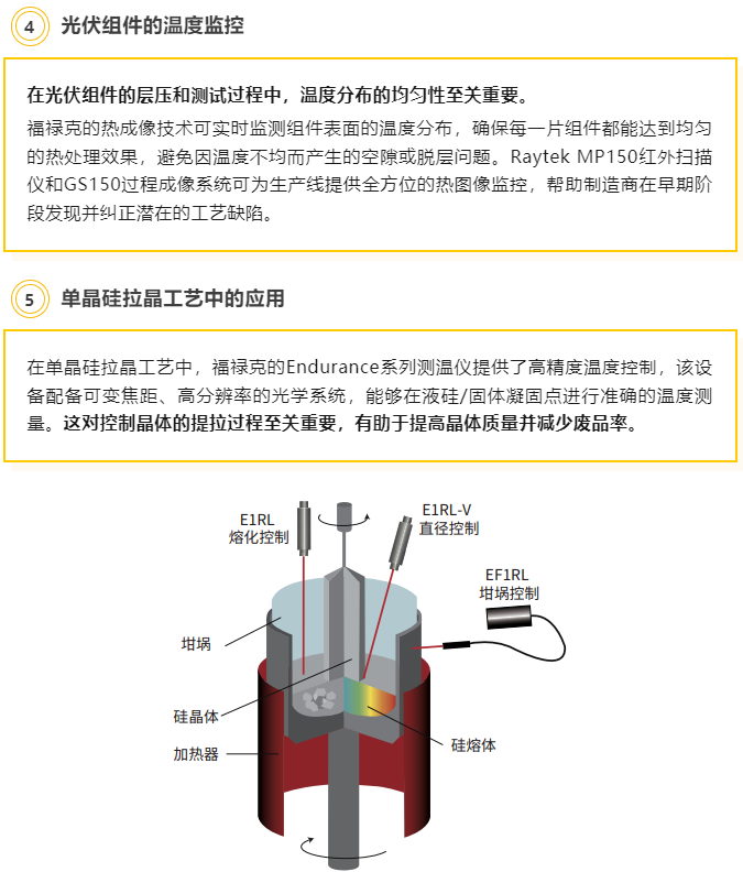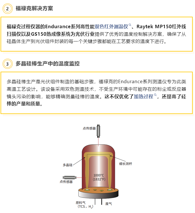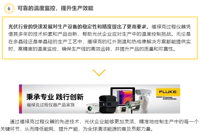 作为温度监控解决方案的全球推动者,福禄克过程仪器 (Fluke Process Instruments) 针对光伏行业独特的生产需求,提供了准确、稳定的温度测量工具,助力提高生产效率和产品质量。其丰富的非接触红外测温技术以及热成像系统在光伏制造工艺中有着广泛的应用,从硅材料生产到光伏组件制造,福禄克产品为行业的每个环节提供了必要的支持。