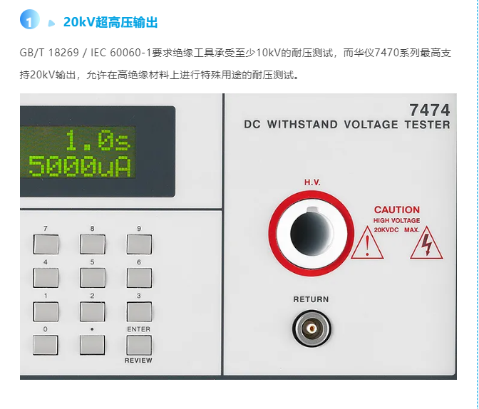 GB/T 18269标准(修改采用IEC国际标准:lEC 60060-1)为保障绝缘工具质量、规范行业发展起到了重要作用。作为手工具行业的重要测试环节之一,耐压测试对于保障工具的绝缘性能和使用安全尤为关键。特别是在不停电作业推广的背景下,可靠的耐压测试设备不仅有助于生产企业提高产品质量,也为作业人员的人身安全提供了坚实的技术保障。华仪7470系列耐压测试仪凭借最高20kV的高电压输出能力,为手工具行业提供理想的测试解决方案。