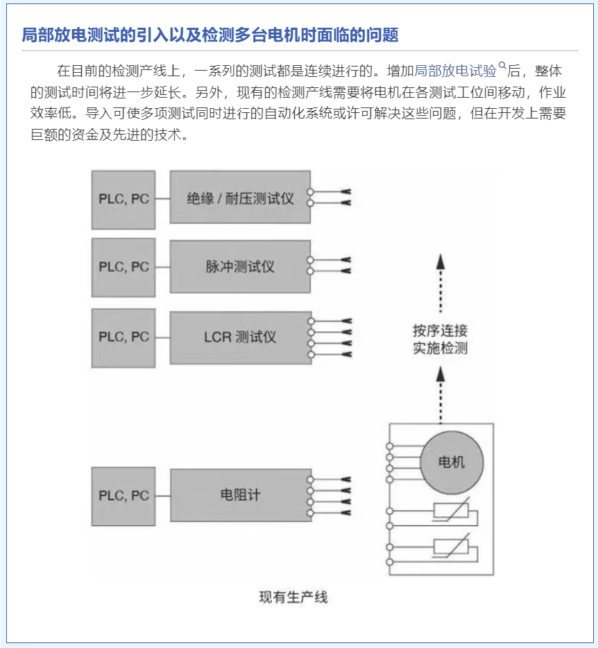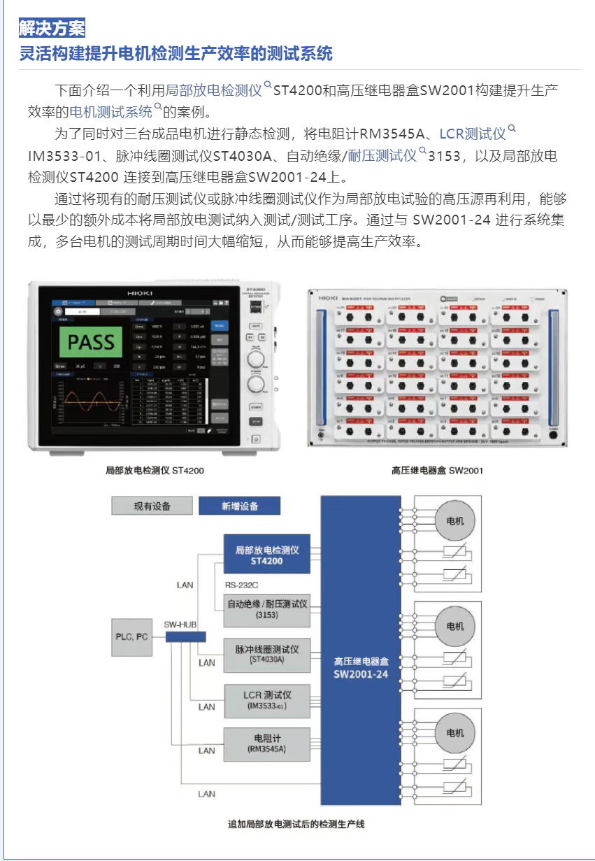 局部放电试验的导入可提高电机定子的品质。HIOKI日置的局部放电检测仪ST4200,利用现有的耐压测试仪和脉冲线圈测试仪作为高压源为客户高性价比的解决方案。此外,与高压继电器盒SW2001搭配使用,可在单个检测工位上同时进行多台电机的多项测试。