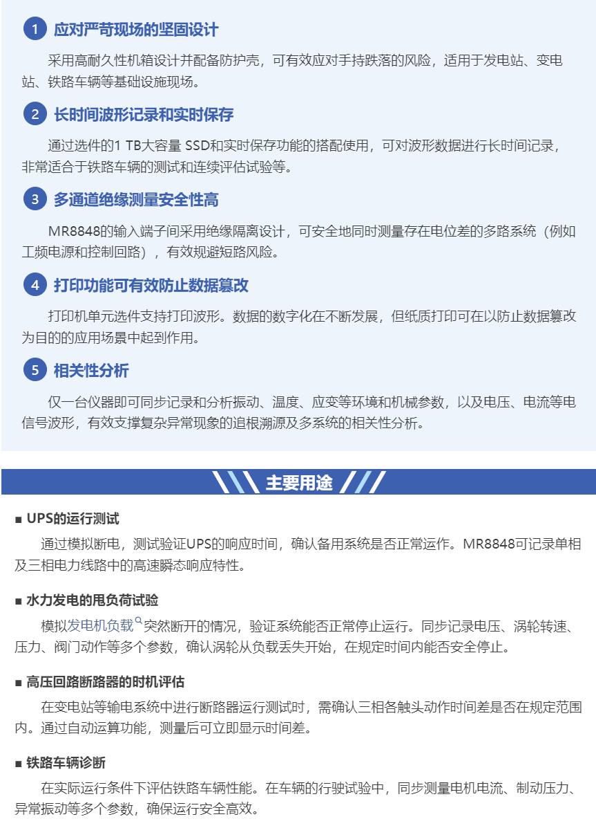 MR8848为电力设备检测、运输系统诊断、基础设施故障分析等各类应用场景提供安全可靠的波形记录。对于在严苛环境下追求精确测量结果的技术人员来说,MR8848是一款值得信赖的工具。