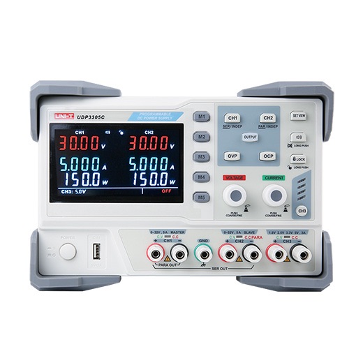 UDP3000C线性直流稳压电源,三路独立输出,两组30V/3A/5A可调输出,一路固定可选输出:电压1.8V/2.5V/3.3V/5V(可微调),电流3A,具有CV与CC模式,短路与过压保护功能,满足多样化的测试需求。